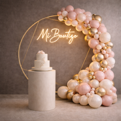 Montaje elegante con tonos blush, ivory y acentos dorados para un ambiente sofisticado.