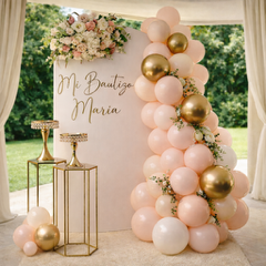 Diseño elegante para bautizo en tonos rosé, ivory y dorado con estética suave y sofisticada.