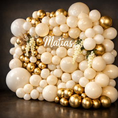 Montaje envolvente tipo bubble wall con estética sofisticada en tonos ivory y dorado.