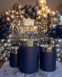 Montaje elegante con fondo shimmer plata, iluminación cálida y guirnalda en azul profundo y metálicos para una celebración premium.