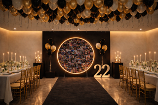 Montaje de alto impacto en negro y dorado con iluminación cálida, pensado para celebraciones elegantes y memorables.