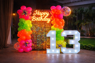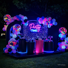 Decoración juvenil y llena de energía con colores neón, fondo shimmer y letrero neón para una fiesta vibrante.