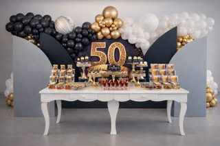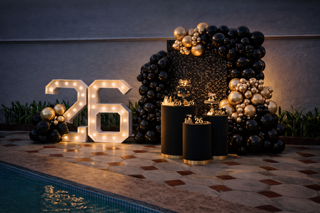 Montaje sofisticado en negro, blanco y dorado para celebrar momentos importantes con una estética atemporal.